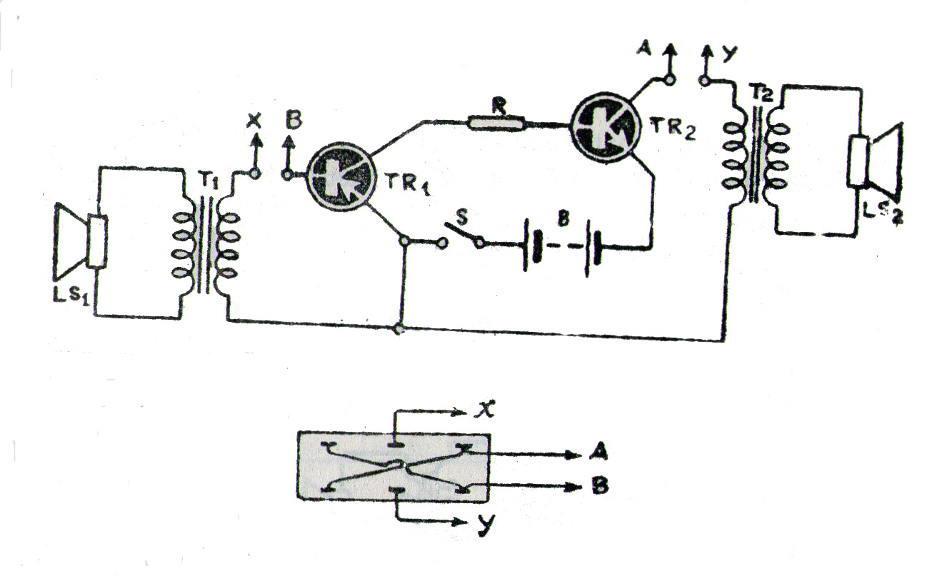 Rangkaian Alat Komunikasi Antar Ruang dapat digunakan sebagai alat komunikasi antar ruang. Di sini hanya diperlukan tambahan sakelar double pole – double throw. Tahap pertama adalah menghubungkan terminal A dengan C dan B dengan D seperti tampak dalam gambar. Gunakan kabel berisolasi. Lepaskan kabel dari gulungan primer yang menghubungkan ke basis transistor PNP. Solder kemudian sepotong kabel pada terminal tersebut dan hubungkan pada tanda “x” dari sakelar DPDT ke basis transistor PNP. Di bawah ini bisa Anda lihat gambar skema Rangkaian Alat Komunikasi Antar Ruang.