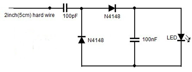 Sebenarnya Rangkaian Detektor Radiasi RF Ponsel ini disebut juga sebagai power meter LED, digunakan untuk menguji peralatan RF. Rangkaian ini dapat mendeteksi daya output pemancar FM hanya dengan menghubungkan voltmeter di tempat beban (LED) dari rangkaian ini. Panjang kawat adalah sangat penting dan harus persis seperti ukuran yang diperintahkan, kalau tidak mungkin menghasilkan pembacaan yang lebih rendah. Kualitas LED adalah faktor yang sangat penting, jadi harus membeli LED yang berkualitas baik, misalnya LED super bright.
