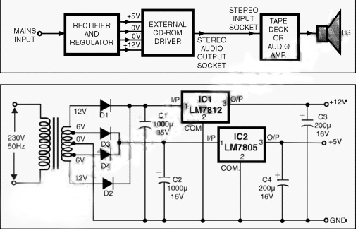 Sebuah CD-ROM drive dapat digunakan sebagai unit yang berdiri sendiri untuk memutar CD audio digital tanpa berinteraksi dengan komputer. Output stereo CD player yang tersedia di jack audio dapat diperkuat dengan menggunakan fasilitas input audio yang biasanya tersedia pada tape-deck/tape-recorder atau amplifier stereo. Soket audio di bagian depan / belakang CD-ROM drive mampu mengemudi headphone atau speaker kurang dari 500mW. Jack stereo yang tepat untuk interkoneksi antara CD-ROM drive dan tape deck tersedia dari komputer / tape recorder suku cadang vendor. Prinsip kerja Rangkaian Digital Audio CD Player digambarkan di sini dengan bantuan diagram blok. Soket 4 pin pasokan listrik yang tersedia di bagian belakang CD player-ROM dimaksudkan untuk +5 V, tanah (dua pin tengah) dan input +12 V. Catu daya dapat dengan mudah diturunkan menggunakan sirkuit listrik konvensional seperti yang ditunjukkan pada gambar. Jika Anda memiliki CD-ROM drive eksternal, dapat hanya terhubung ke saluran listrik karena memiliki rangkaian dalam catu daya mandiri.