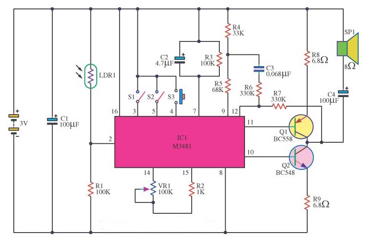 Sebenarnya ada tiga buah Rangkaian Music Box yang kami miliki, namun untuk kesempatan kali ini kami tampilkan dulu yang ini. Music box serbaguna ini menggunakan IC M3481. Ini adalah kotak musik terintegrasi yang menarik dengan rangkaian sederhana dan biaya terjangkau. Otak utama dari rangkaian tersebut adalah IC1. Ini adalah IC generator suara. Ada 8 jenis musik/melodi yang keluar dari perangkat ini. Ketika power supply LDR1 terbuka menyebabkan penurunan tegangan R1 cukup untuk membuat IC1 memiliki output untuk merangsang pin 11 dan pin 12 guna merangsang pin B dari Q1.