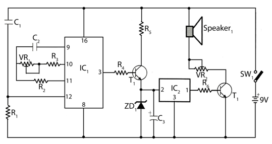Dioda zener ZD1 digunakan sebagai regulator yang mengurangi pasokan listrik yang diperlukan untuk pengoperasian IC2 yaitu 3.3V. Terakhir, output musik merupakan output dari pin 1 dari IC2 yang diumpankan ke pengeras suara melalui pengemudi transistor dan volumenya dikendalikan oleh pengaturan VR2. Untuk memulai pendayaan Rangkaian Pewaktu Sederhana ini harus dipasok dengan menekan saklar SW1.
