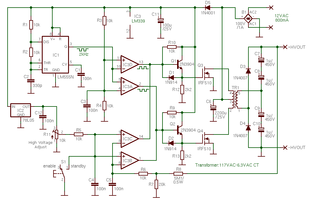 Tegangan input dari tegangan tinggi arus 12V AC pada 800mA kemudian dikonversi ke DC melalui penyearah jembatan Diode 1A. Tegangan output dari rangkaian dapat disesuaikan dalam kisaran 0–1000V DC. Tegangan tinggi ini menggunakan transformator sebagai dasar dan beberapa komponen aktif lainnya termasuk IC timer 555, IC CMOS 4001, IC regulator tegangan 78L05, beberapa transistor NPN dan sepasang IRF510 logika MOSFET sebagai penguat akhir.
