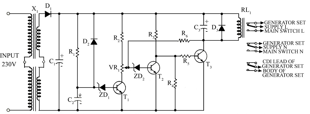 Adapun prinsip kerja Rangkaian Saklar Otomatis Dari Generator ke Catu Daya Utama ini sebagai berikut. Ketika garis suplai tegangan melintasi tingkat preset, Dioda Zener ZD4 memecah dan dengan demikian transistor T2 bekerja, T3 tidak bekerja, menyebabkan relay untuk de-energise. Gelombang tegangan pada saat kembalinya daya dilindungi oleh rangkaian penundaan sekitar transistor T1.