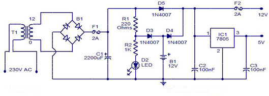 Rangkaian UPS sederhana dapat memberikan 12 Volt unregulated dan 5 Volt DC regulated. Transformator T1 memundurkan tegangan listrik ke 12V AC dan kemudian jembatan B1 merektifikasi itu. Sinyal diperbaiki dan dihaluskan oleh kapasitor C1. Ketika pasokan listrik tersedia baterei akan diisi melalui dioda D3 dan IC regulator mendapat pasokan melalui dioda D5.  12V dan 5V DC akan tersedia di terminal output. Bila pasokan listrik tidak tersedia maka  baterei memasok arus ke IC regulator dan ke terminal 12V DC melalui dioda D4. Dioda D3 memblok pembalikkan aliran arus selama mode baterai. Kapasitor C2 dan C3 bertindak sebagai filter.